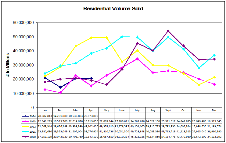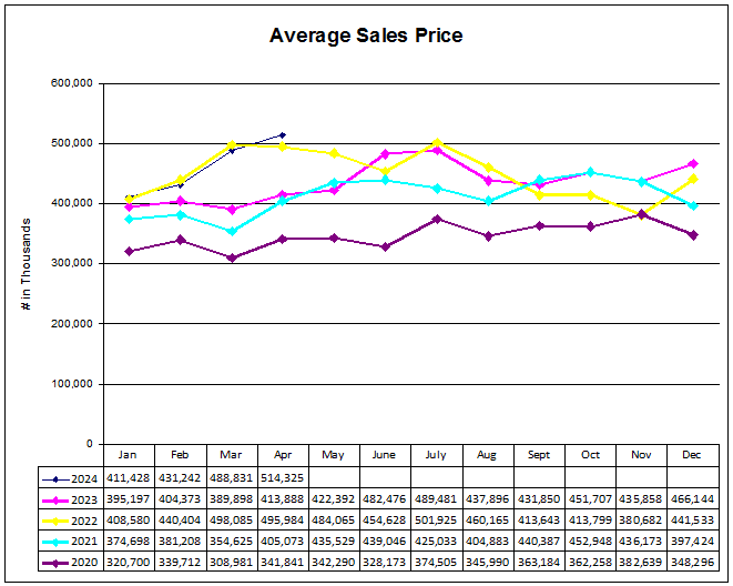 You'll notice the three graphs including the Tuolumne County Residential Unit Sales through April 2024 graph versus the previous 4 years (Picture 1 below) along with the Tuolumne County Residential Volume Sales graph versus the previous 4 years (Picture 2 below) and the Tuolumne County Residential Average Sales Price graph versus the previous 4 years (Picture 3 below), respectively.