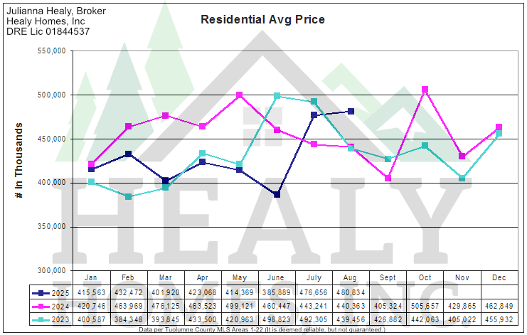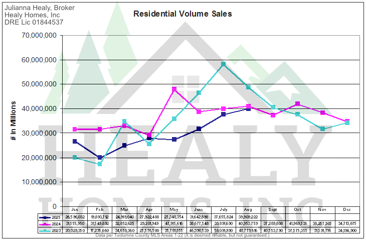 You'll notice the three graphs including All Tuolumne County Residential Unit Sales through August 2025 graph versus the previous 2 years (Picture 1 below) along with All Tuolumne County Residential Volume Sales graph versus the previous 2 years (Picture 2 below) and All Tuolumne County Residential Average Sales Price graph versus the previous 2 years (Picture 3 below), respectively.