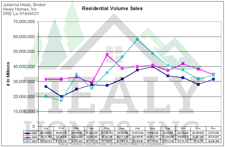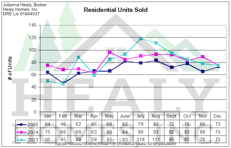 You'll notice the three graphs including All Tuolumne County Residential Unit Sales through December 2025 graph versus the previous 2 years (Picture 1 below) along with All Tuolumne County Residential Volume Sales graph versus the previous 2 years (Picture 2 below) and All Tuolumne County Residential Average Sales Price graph versus the previous 2 years (Picture 3 below), respectively.