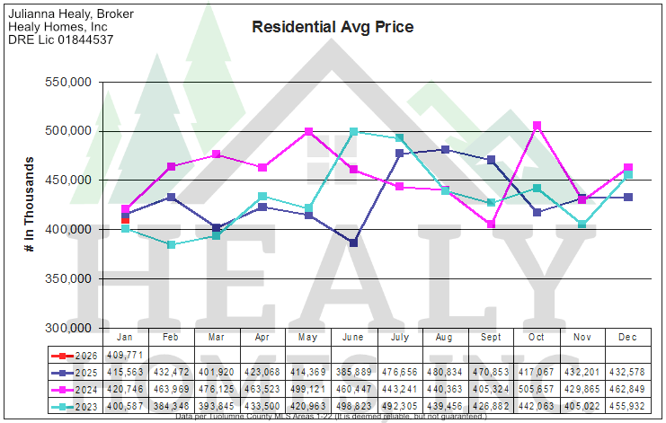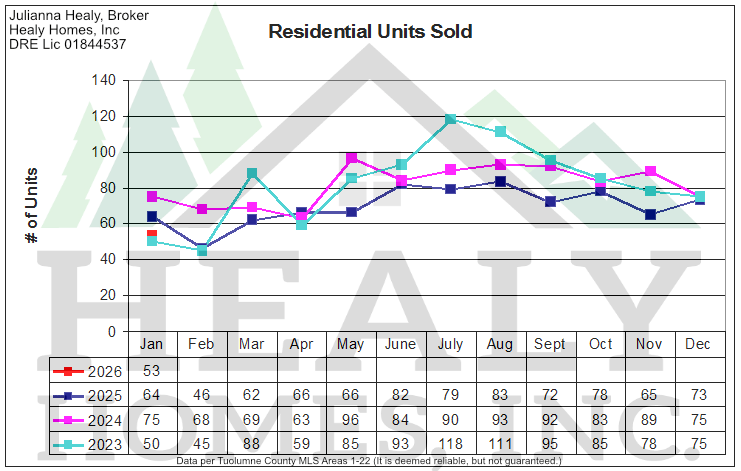 You'll notice the three graphs including All Tuolumne County Residential Unit Sales through January 2026 graph versus the previous 3 years (Picture 1 below) along with All Tuolumne County Residential Volume Sales graph versus the previous 3 years (Picture 2 below) and All Tuolumne County Residential Average Sales Price graph versus the previous 3 years (Picture 3 below), respectively.
