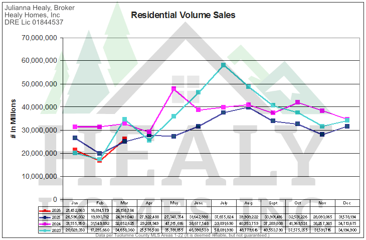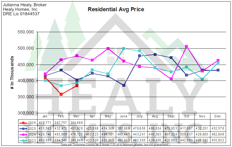 You'll notice the three graphs including All Tuolumne County Residential Unit Sales through March 2026 graph versus the previous 3 years (Picture 1 below) along with All Tuolumne County Residential Volume Sales graph versus the previous 3 years (Picture 2 below) and All Tuolumne County Residential Average Sales Price graph versus the previous 3 years (Picture 3 below), respectively.
