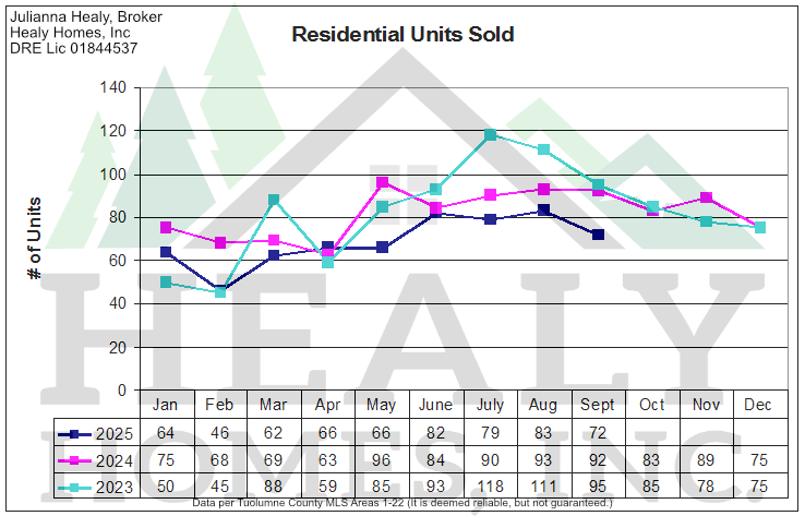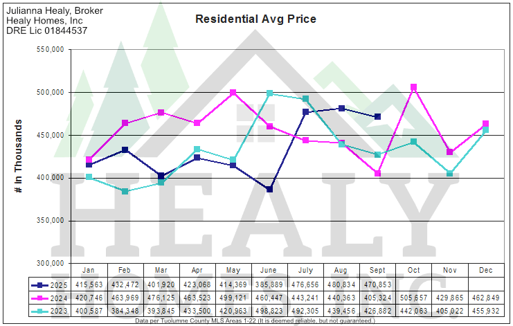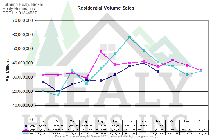 You'll notice the three graphs including All Tuolumne County Residential Unit Sales through September 2025 graph versus the previous 2 years (Picture 1 below) along with All Tuolumne County Residential Volume Sales graph versus the previous 2 years (Picture 2 below) and All Tuolumne County Residential Average Sales Price graph versus the previous 2 years (Picture 3 below), respectively.